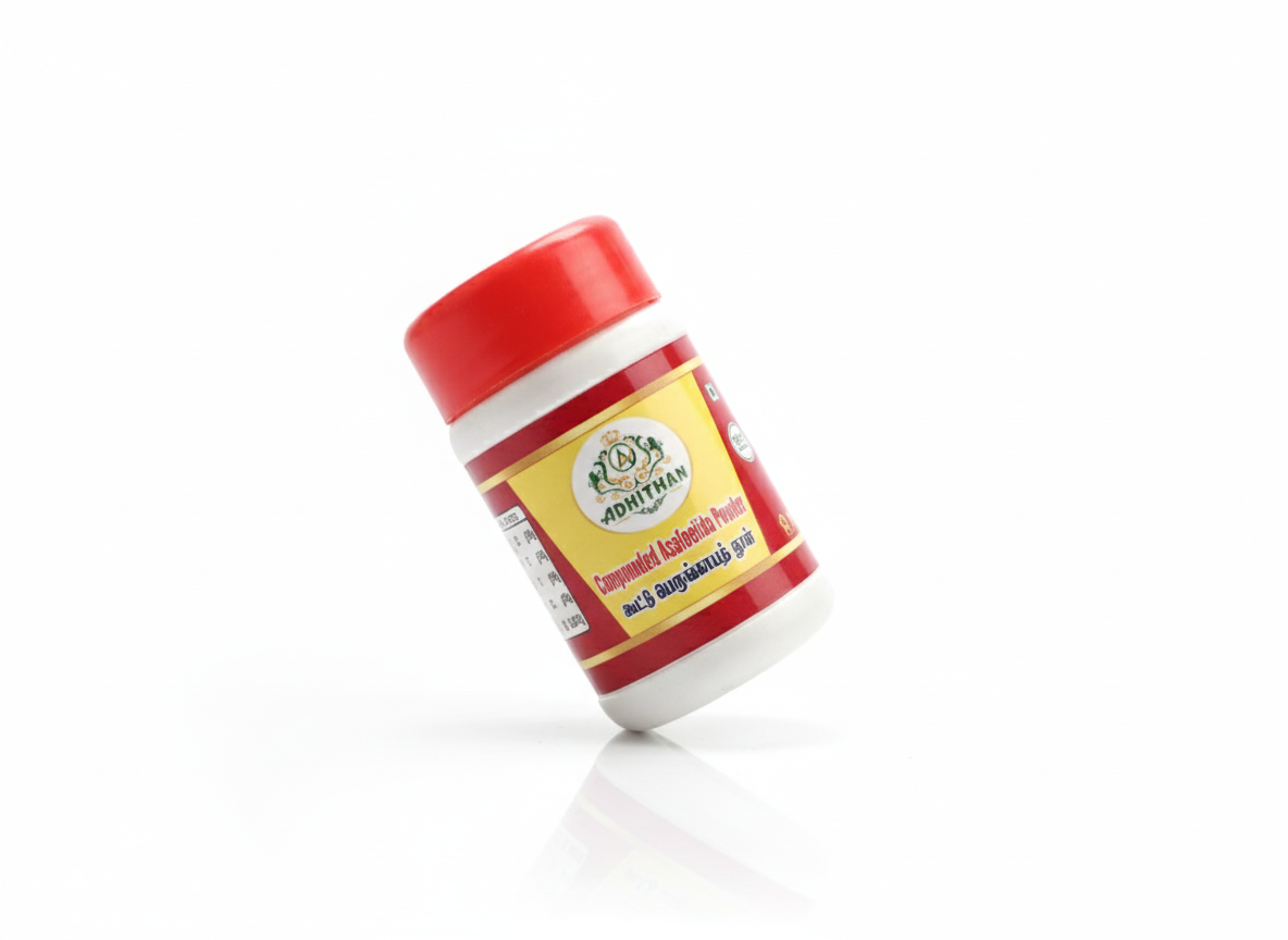 Adhithan Compounded Asafoetida Powder adds an authentic aroma and a rich traditional flavor to your daily cooking. Known for its medicinal properties, it aids in digestion and helps relieve bloating. Processed with the highest quality standards, it is an essential ingredient for Sambar, Rasam, and various Indian curries.